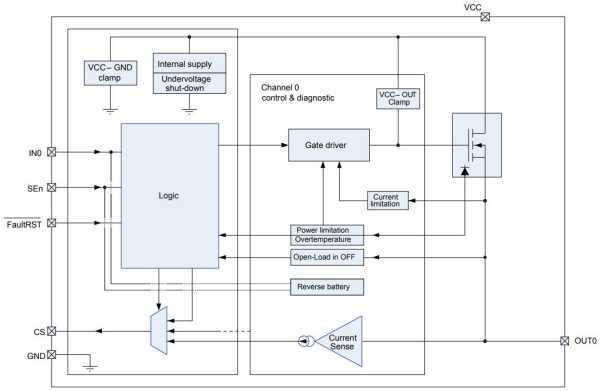 Щоб сповістити хост-контролер, відгук мультиплексується на штифт. Це включає: струм, пропорційний струму навантаження, а також індикацію: перевантаження, замикання на землю, теплового вимкнення, відкритого навантаження у вимкненому стані (потрібне зовнішнє підтягування) і замикання вихідного сигналу на Vcc.
