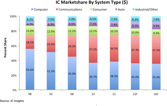 Рис. 1 показує, що частка ринку автомобільних мікросхем стабільно зростає з 1998 року з 4,7% від загального обсягу продажів мікросхем того року до 7,4% у 2021 році.
