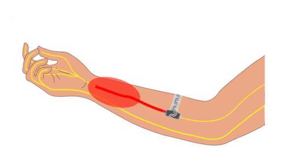 Імплантований пристрій обертається навколо периферичного нерва, щоб блокувати сигнали до мозку. Червоний овал на малюнку вказує на область болю. (Джерело: Північно-західний університет)
