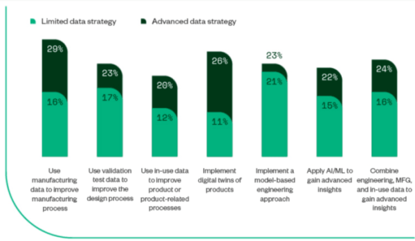 Незважаючи на те, що 65% вважають, що стратегія даних є необхідною для оптимізації життєвого циклу продукту, 47% компаній використовують обмежену стратегію даних, лише 29% компаній із розширеними програмами обробки даних повністю здатні використовувати виробничі дані для покращення виробничих процесів, і лише 24 % об’єднують інженерні, виробничі та поточні дані, щоб отримати розширену інформацію. Крім того, 74% компаній не використовують дані про продукт для впровадження цифрових двійників.