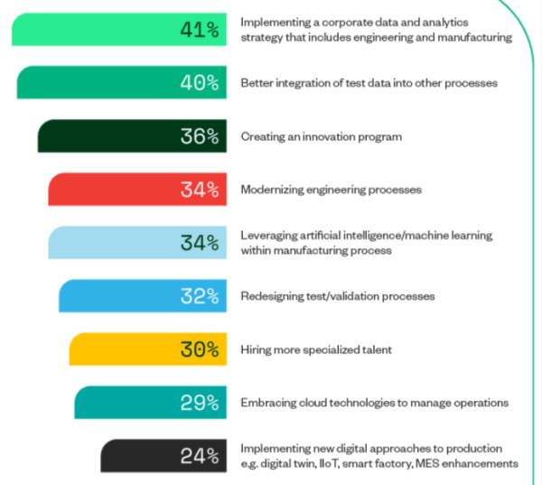 Інші найпопулярніші ініціативи включають впровадження корпоративної стратегії даних і аналітики, яка включає проектування та виробництво (41%), створення інноваційної програми (36%), модернізацію інженерних процесів (34%) і використання штучного інтелекту /машинне навчання в процесі виробництва.